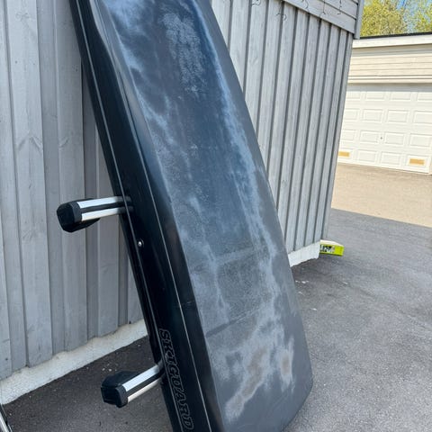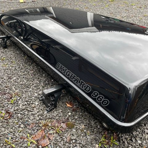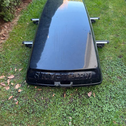 Skiguard 950 takboks i svart utførelse. Takboksen er beregnet for montering på takstativ på bil og gir ekstra lasteplass til for eksempel ski, bagasje og annet utstyr. Modellen åpnes fra siden og har aerodynamisk form. Festeanordninger til takstativ følger med slik det vises på bildene. Ytre tilstand og eventuelle skader fremgår av bildene. Mont Blanc takstativ