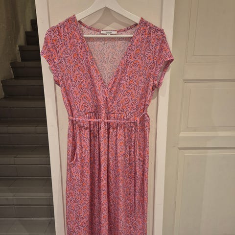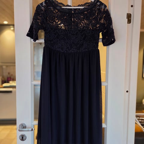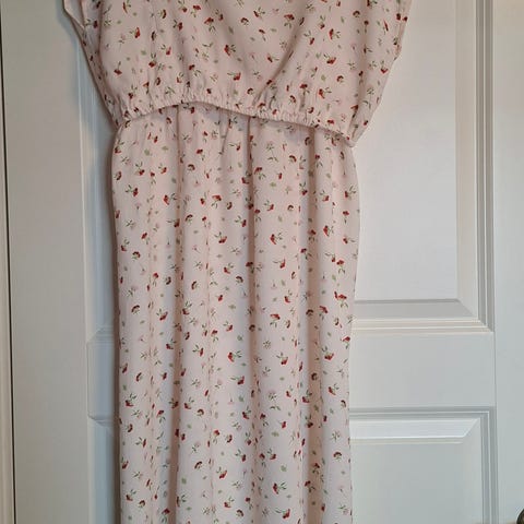 MAMALICIOUS mammakjole i størrelse S. Kjolen er laget av bomull og har et mønster med prikker. Den har kort erm/ermeåpning, rund hals og strikk i midjen for bedre passform over magen. Lengden går omtrent til kneet, avhengig av høyde. Egner seg til hverdagsbruk under graviditet.