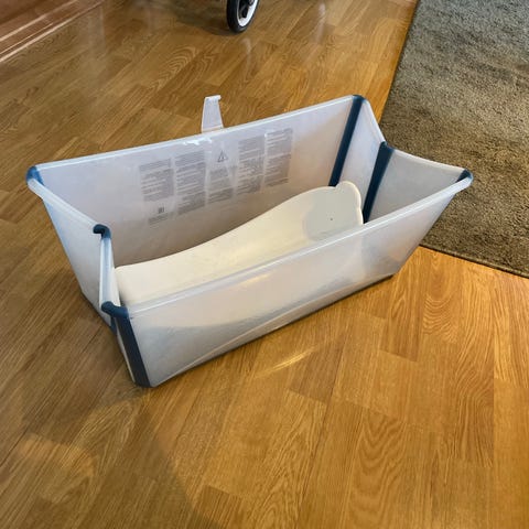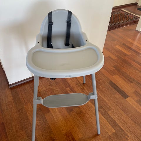 BabyBjörn barnestol som strammes til spisestolen. Mangler belte (men ikke det som brukes mellom setet og spisestolen)