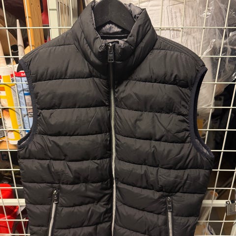 Zara vest for herre i størrelse S. Vesten er svart og laget i polyester med vattert, quiltet design. Den har høy krage og glidelås i front. Sidelommer med glidelås gir plass til småting. Egnet som ytterplagg eller mellomlag i kjøligere vær.