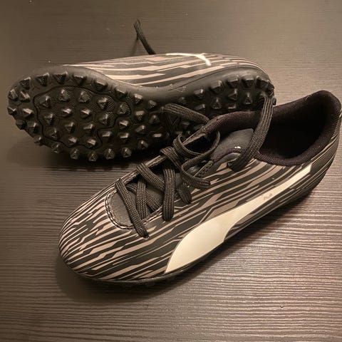 Puma fotballsko i størrelse EU 36 (UK 3,5 / US 4,5 / CM 22,5). Skoene er i svart med blå Puma-logo og detaljer. Knottene er utformet for bruk på gressbane. Overdelen er i syntetisk materiale med snøring for justerbar passform. Egnet som fotballsko til barn eller mindre føtter. Pent brukt (raskt vokst ut av).