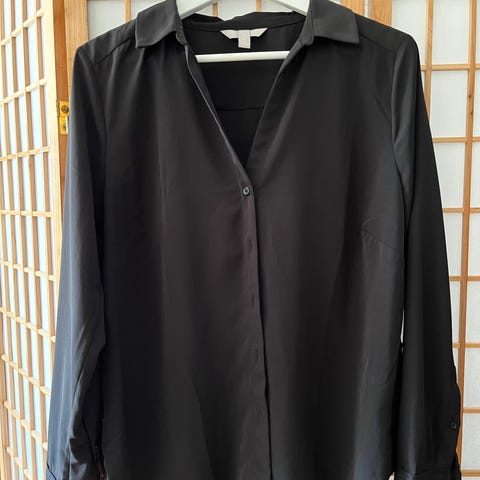 Fin og klassisk sort skjorte fra Bik Bok i strørrelse L .Skjorten har lange ermer ,krage og knapper foran . Lett og behagelig stoff som faller fin - passer både til hverdag og mer elegante anledinger .Perfekt til jobb, eller som en del av en stilren garderobe .