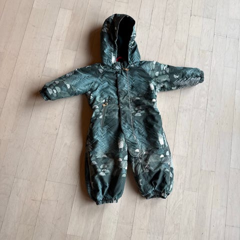 Ene fotstrikken har røket. Og et lite rift i ytterstoffet på ca 1 cm. Litt blekere i stoffet på knær og baken. Kult mønster og håndleddsvarmere med hull til tommel.