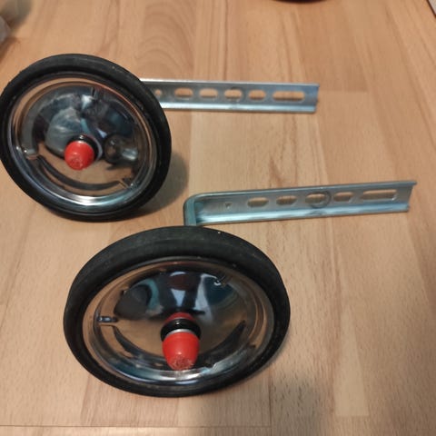 Støttehjul til barnesykkel med hjulstørrelse 12". Sett med to støttehjul med metallbraketter for montering på bakhjul. Hjulene har gummiert kant og er festet med bolter og muttere. Egnet som ekstra støtte for mindre barn som lærer å sykle på 12" barnesykkel.
