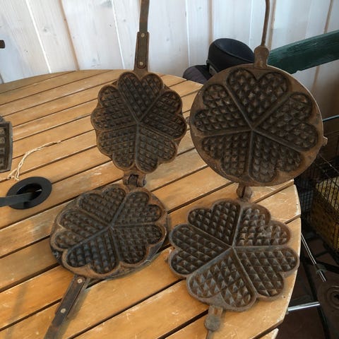 To vaffeljern i støpejern. Tradisjonelt vaffeljern med hjerteformet mønster, beregnet for bruk på komfyr eller over åpen varme. Jernet har langt håndtak i metall med trehåndtak ytterst. Egner seg til steking av klassiske, tynne vafler. Selges for kr 50 pr stk