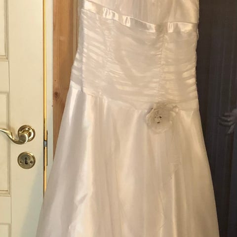 Zara brudekjole. Kjolen har stroppeløst liv med markert overdel og utsvingt skjørt i lett, blankt stoff. Dekorative stoffroser og bånddetaljer foran