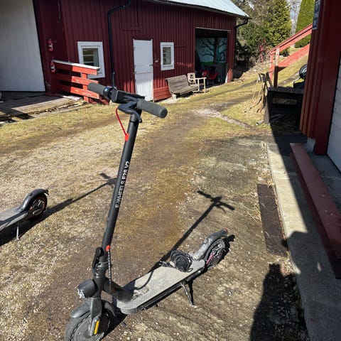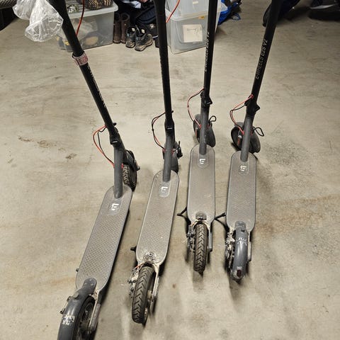 Nr.1- På denne står det forholdsvis nye pungteringsfrie dekk. De ble montert på og kjørt et par turer, før sparkesykkelen sluttet å funke. Mangler bakskjerm. Styrestammen er "løs", så den svinger uten å ta med hjulet.
