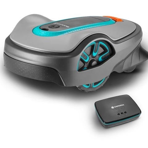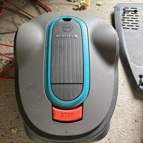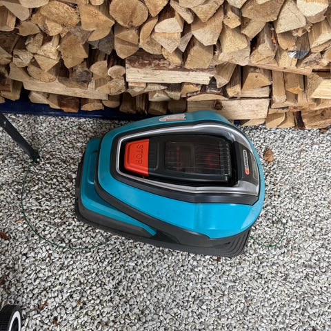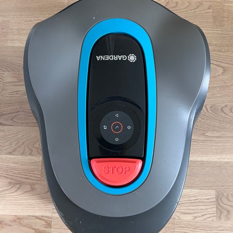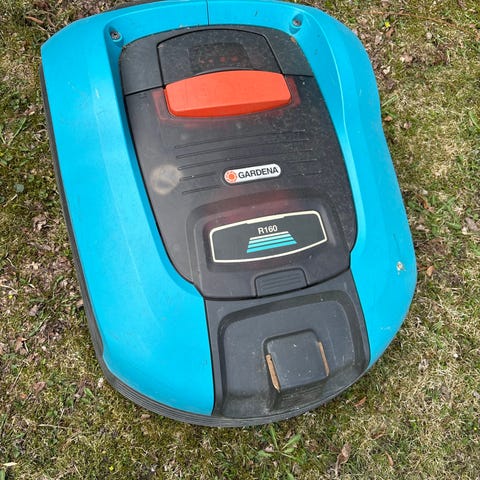 Eldre modell av robotgressklipper som har stått lagret inne siden 2022. Kjøpt i 2018 for 15.000 kr og fungerte fint når den ble lagret for vinteren 2021/2022.
