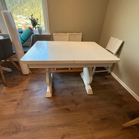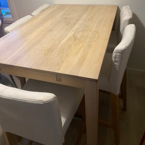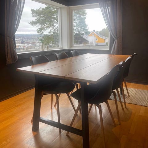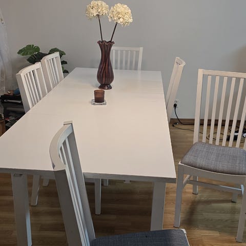 Spise bord + 6 stoler. Følger med ileggsplate så det kan bli større. 140-220cm.