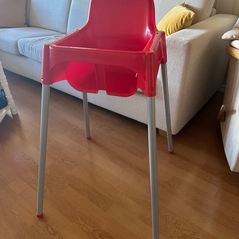 IKEA høy barnestol i hvit plast med metallben. Stolen har enkel sitteflate med ryggstøtte og sikkerhetsbelte i setet. Egnet som spise- og sitteplass for små barn ved bord. Lett konstruksjon som er enkel å flytte og rengjøre.