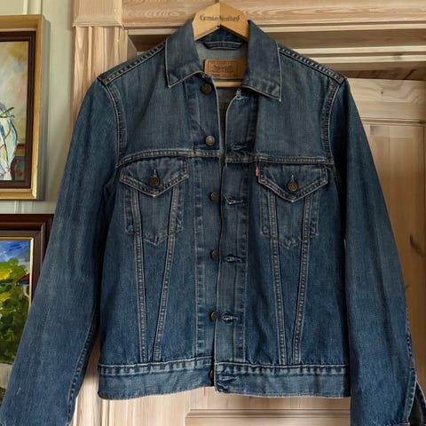 Levi's olajakke i denim for dame i størrelse M. Jakken er i lys blå denim med klassisk krage, knappelukking foran og brystlommer med klaff og knapp. Lange ermer med mansjetter med knapp. Typisk jeansjakke-modell som passer til hverdagsbruk og kan kombineres med ulike antrekk gjennom sesongene.