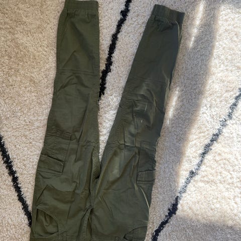 Vailent bukser for herre i størrelse L. Buksen er grønn og laget av bomull. Den har strikk og snøring i livet, samt strikk nederst ved anklene. Flere lommer, inkludert cargolommer på sidene og lommer bak. Passer som hverdagsbukse eller til fritidsbruk.
