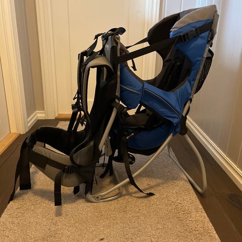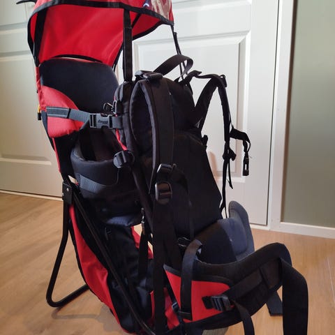 Bergans bæremeis for barn i rød og blå farge. Bæremeisen har ramme i metall med støttebein som gjør at den kan stå på gulvet når barnet settes inn og tas ut. Den har polstret rygg og skulderstropper, samt hoftereim og justerbare stropper for å tilpasse passformen til den som bærer. Setet til barnet har sikkerhetssele og høy ryggstøtte. Egnet til å bære mindre barn på tur og ved gåing der barnevogn ikke er praktisk.