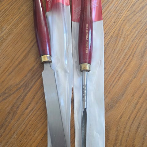 Tre jern som jeg tror (!) er for mindre uthuling, eller finere detaljer, på dreiearbeider. NB : spissen på det ene jernet er løs. Jeg ser ikke tegn på at noe er ødelagt, så jeg antar at det er riktig (?). Den kan altså tas ut, og den roterer. Selges samlet. Kan hentes i Oslo.