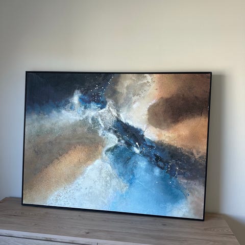 Helt nytt! Abstrakt og nydelig litografi (nr 14 av 30) i varme toner. Bildet har et horisontalt format mål: 180x92 og ble kjøpt med ramme hos Galleri Havstad i Drøbak i november 2025, pris: 14,200. Jeg har kvittering. Har nylig arvet et like stort bilde og har dessverre ikke plass til begge.