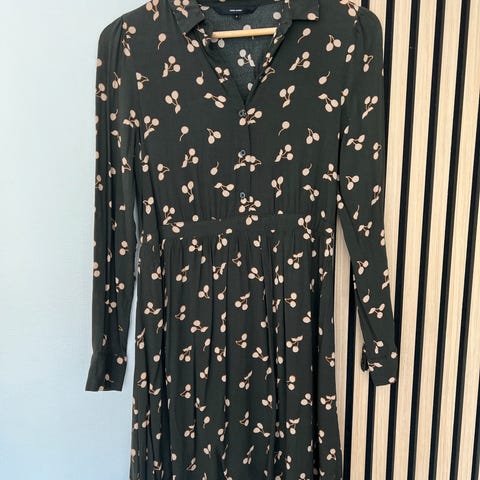 Vero Moda hverdagskjole for dame i størrelse S. Kjolen er i grønn farge og laget av bomull. Modellen har krage, knappelukking foran og lange ermer med mansjetter. Volangdetaljer foran og bak gir et markert liv og lett utsvingt skjørt. Lengden er kort, omtrent til over kneet, og passer til hverdagsbruk eller enkle anledninger.