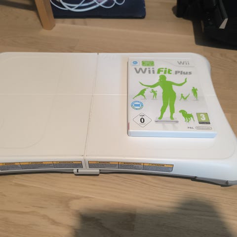 Nintendo Wii spillkonsoll med tilhørende Wii Fit-brett og tilbehør. På bildet vises selve Wii-konsollen, Wii Fit-brett, sensorstang, strøm- og tilkoblingskabler samt en Wii-kontroller. Konsollen er egnet for bruk med bevegelsesstyrte spill og treningsspill som Wii Fit. Flere spill og ekstrautstyr kan kobles til etter behov, avhengig av hva kjøper allerede har eller ønsker å bruke sammen med konsollen.