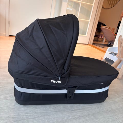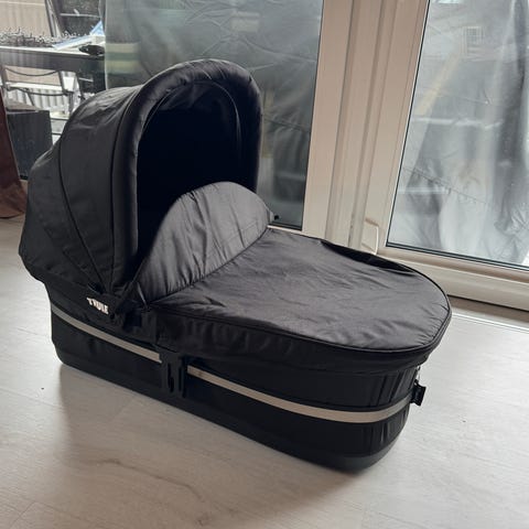 Thule bagdel til barnevogn i svart tekstil. Liggedelen har polstret kant rundt hele liggeflaten og avtagbar madrass.