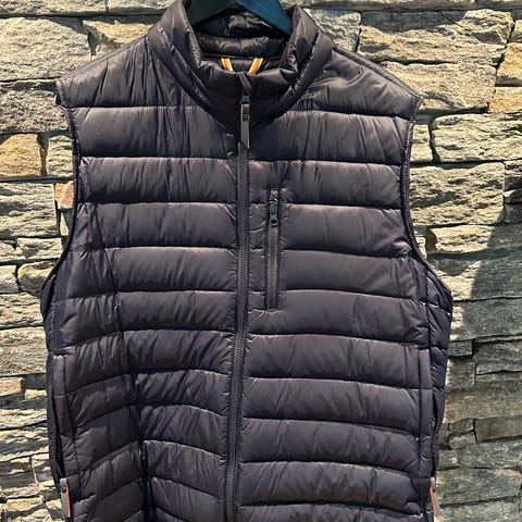 Kun brukt 1 gang, så den er som ny 👌orginal pris på 1699 ingen bruksmerker. Vesten er oransje med horisontale quiltede sømmer og høy krage. Den har glidelås i front, to sidelommer med glidelås og en brystlomme med glidelås. Innsiden er lys med flere innerlommer. Fyllet er dun, og plagget er merket med RDS-sertifisert dun. Vesten er lett, dunisolert og vannavvisende ifølge merking, egnet som ytterplagg eller mellomlag i kjøligere vær.