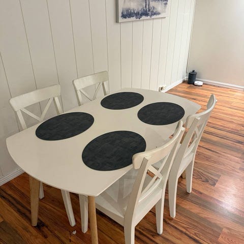 De er ca 7 år gamle, og har en del slitasje. selges kun samlet til 450kr. Stolene må hentes i Asker sentrum.