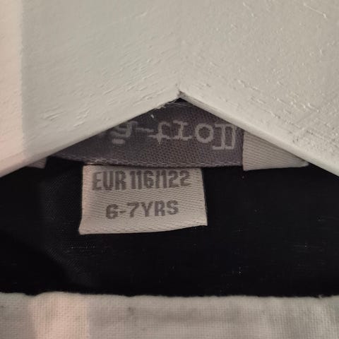 Festdrakt sydd av gjenbrukstekstiler i str 6 år, men den passer nok også str 5 år, samt at den kan justeres.