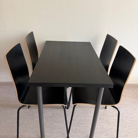 Bordet diameter 118. Høyde 75 Ingen slark på stoler eller bord