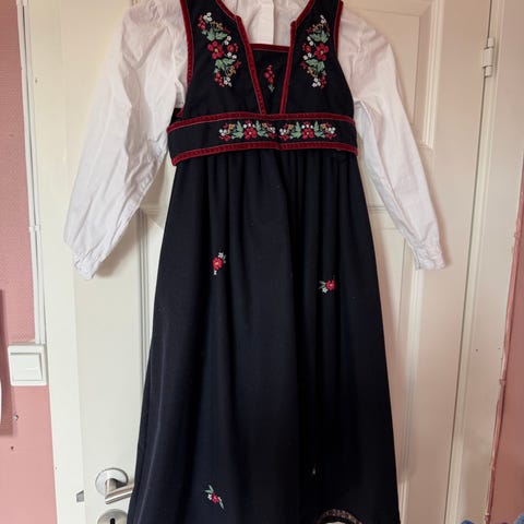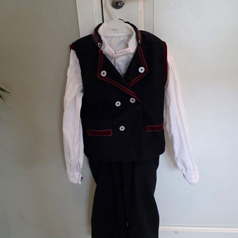 Drakt str 122, skjorte 128. Mørkeblå med bånd i burgunder velour.
