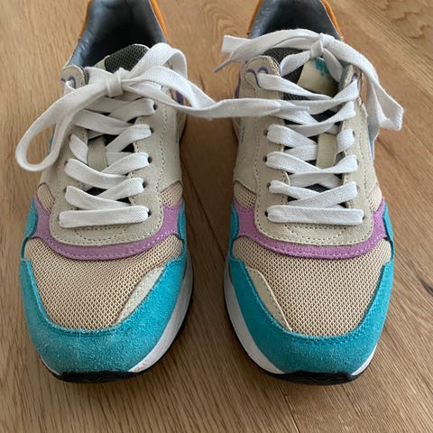 Fargerike modell med overdel i tekstil og semsket materiale i flere farger, blant annet oransje, lilla, turkis og hvitt, med hvite lisser og gummisåle.