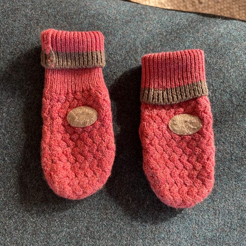 Lillelam votter i ull i blå farge, unisex, i størrelse 86/92. Vottene er strikket i myk ull med ribbestrikket vrangbord og strukturstrikk på håndryggen.