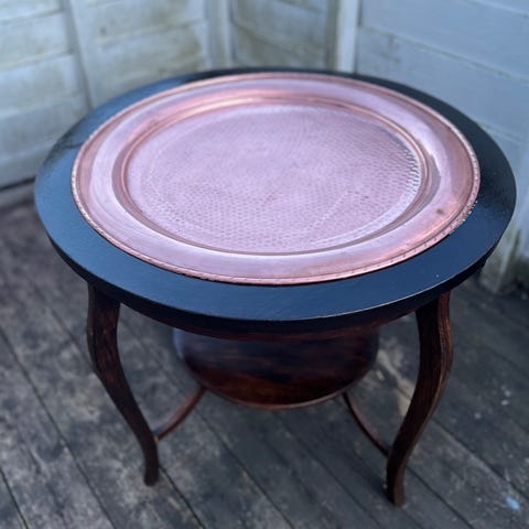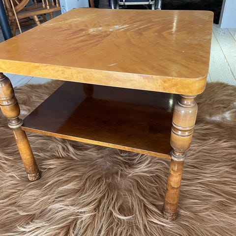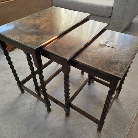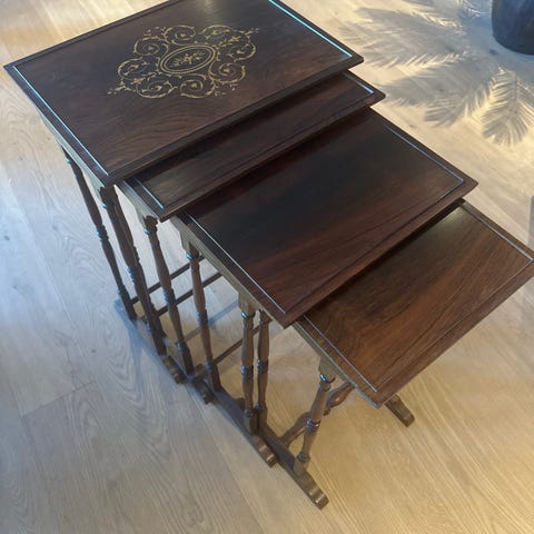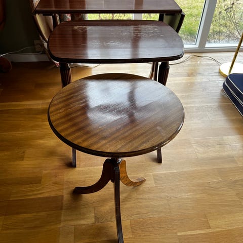 Nestingbord sett med 3 trebord i brun utførelse. Bordene kan skyves inn i hverandre for plassbesparende oppbevaring. Klassiske, slanke bein og rektangulære bordplater med finert treverk og synlig trestruktur. Egnet som sidebord, småbord eller avlastningsbord i stue, gang eller andre rom. Det største bordet har en slitt topplate, mens det minste har en ripe. Muligens kirsebærtre. Høyde 65c, bredde 47cm, dybde 35cm.
