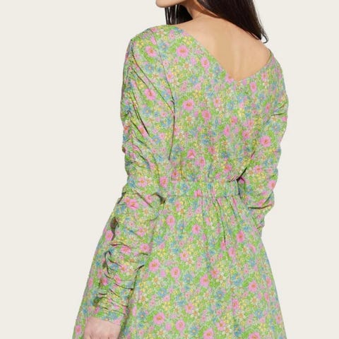 By Malina sommerkjole for dame i størrelse M. Kjolen er laget i viskose og har et flerfarget blomstermønster med grønn bunnfarge. Modellen har lange ermer, knappestolpe øverst og snøring i midjen. Skjørtet er langt med volanger/lagte partier som gir vidde. Passer til bruk på varme dager, ferie og andre anledninger der en lett og luftig kjole er ønsket.