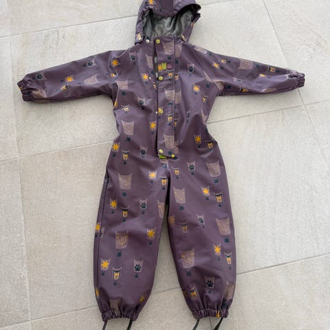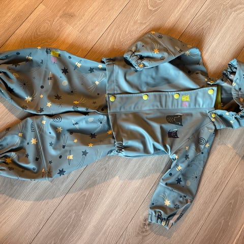 Godt brukt regndress selges. Fotstrikk mangler og katten på glidelåsen er knekt. Dressen er tett og har mye bruk igjen.