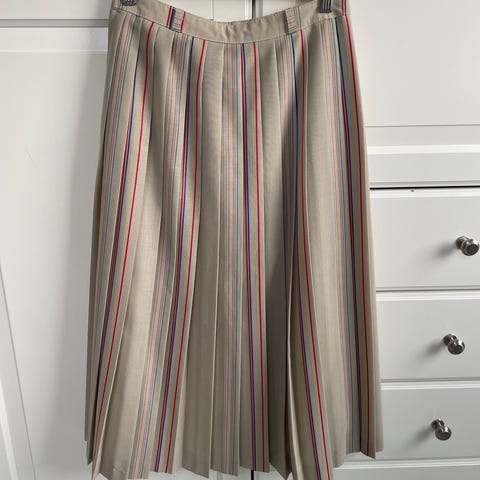 Knapt brukt vintage midiskjørt med plisser. Hvitt og grått. Str 36.