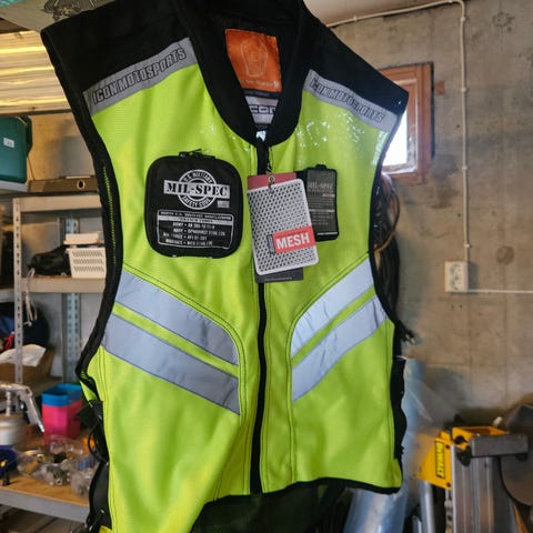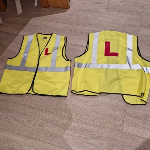 Godkjent refleksvest med L på ryggen til øvelseskjøring av MC. Jeg har 2 stk. 150 pr. stk. Str XL stor og god til å ha på utsiden av dressen eller mc-jakka