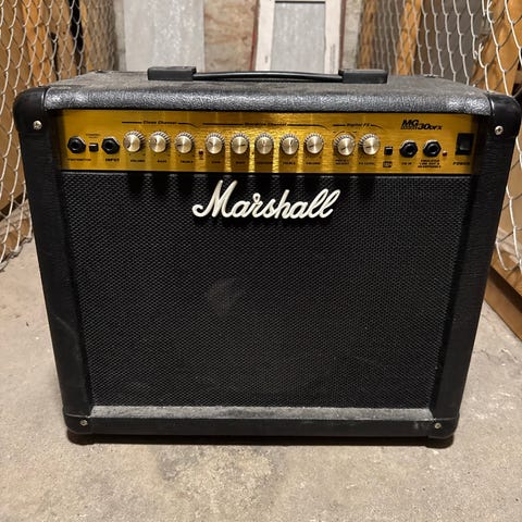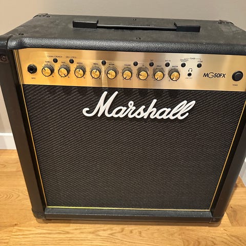 Marshall MG15FX gitarforsterker. Kompakt combo-forsterker egnet til elgitar, med flere kontroller for lydjustering, blant annet gain, bass, middle, treble, reverb, volum og master. Forsterkeren har innebygde effekter og tilkoblinger plassert på frontpanelet. Det følger med et beskyttelsestrekk med Marshall-logo som kan brukes til lagring og transport. Passer til øving hjemme eller i mindre rom der det er behov for en praktisk gitarforsterker.