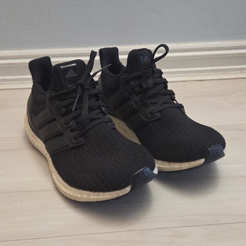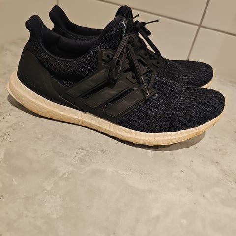 Modellen er helsvart med strikket overdel og snøring. Sålen har Boost-demping og yttersåle med karakteristisk mønster for godt grep. Skoene har tekstil- og syntetisk overdel med polstret hælkappe for bedre komfort.