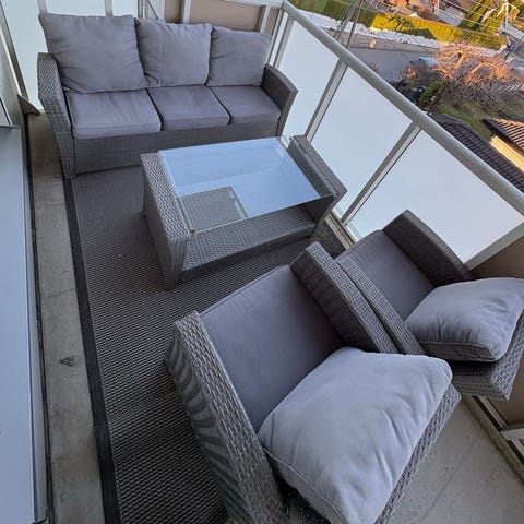 Hagemøbelsett i kunstrotting bestående av en 2-seter sofa, to stoler og et rektangulært bord. Møblene er i svart flettet kunstrotting med lyse sitteputer. Settet passer til bruk på balkong, terrasse eller i hagestue. Rundformede pynteputer følger ikke med. Bordet har matchende kunstrotting-overflate. Setene har armlener og rette ryggstøtter for normal sittekomfort. Putene er noe slitt, men disse kan byttes ut etter ønske.