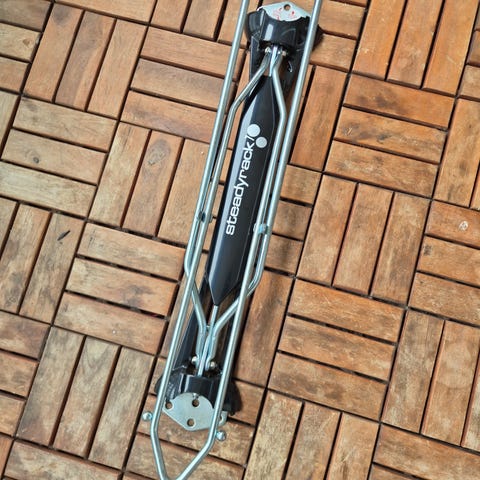 SteadyRack sykkelstativ for veggmontering i svart farge. Stativet er konstruert for å holde en sykkel vertikalt langs veggen for plassbesparende oppbevaring. Metallramme med plastbelagt hoveddel. Bildet viser medfølgende monteringsdeler som skruer og festeplater. Egnet for innendørs montering i garasje, bod eller lignende der man ønsker organisert oppheng av sykkel.