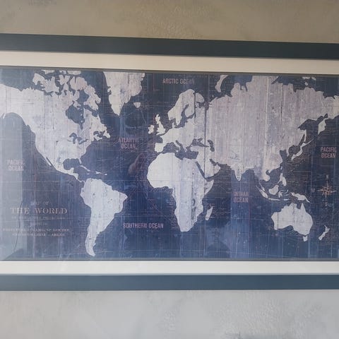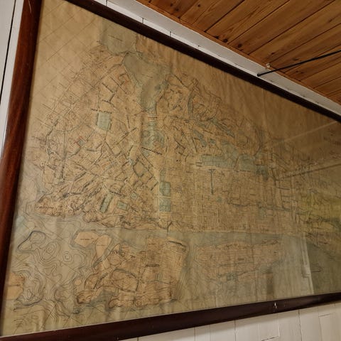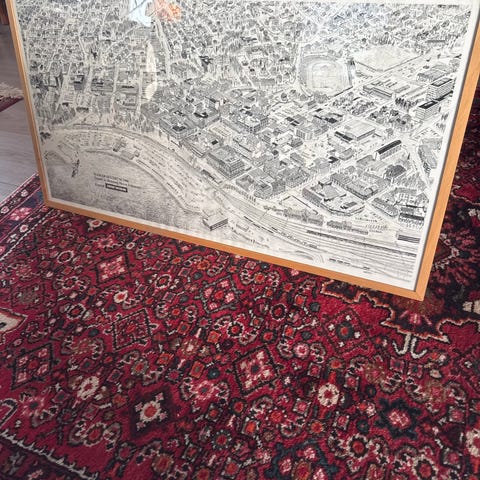 Plakaten er montert i en rektangulær treramme med lys brun finish. Bildet er egnet som veggdekor i stue, kontor eller arbeidsrom, og passer for den som ønsker et kartmotiv med klassisk uttrykk.