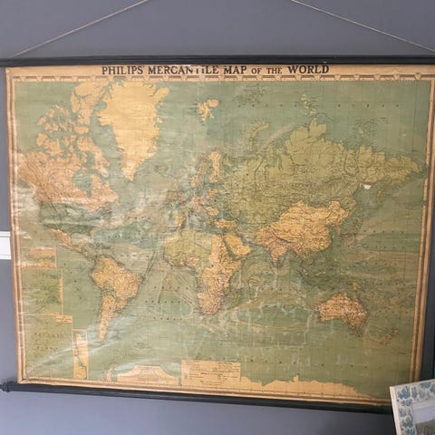 Innrammet verdenskart plakat med flere historiske kartutsnitt av ulike verdensdeler. Kartene viser blant annet Europa, Afrika og Sør-Amerika med illustrasjoner av skip, personer og dekorative rammer rundt motivene.