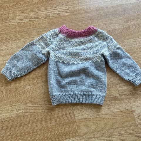 Selger en hjemmestrikket genser med traktor mønster i ca. str. 110.