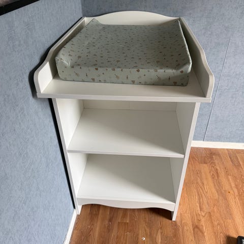 IKEA stellebord/stellekommode i hvit utførelse. Stellebordet har en romslig stelleflate med kant rundt, samt god oppbevaringsplass under. På den ene siden er det tre skuffer, og på den andre siden åpne hyller for enkel tilgang til bleier, klær og utstyr. Egnet til bruk på barnerom eller bad der det er behov for en fast stelleplass med integrert oppbevaring.