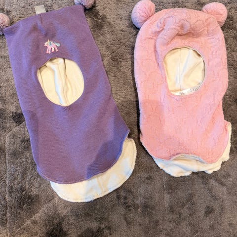Søt 2 pakning med luer til barn i bomull med en liten brett som fungerer som sovemaske. Lyse blå og hvit, eller rosa og off-white. Vil tro at de passer til barn fra 5 mnd til 1 år.
