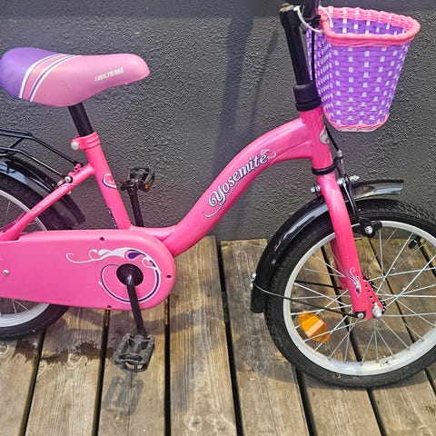 Yosemite barnesykkel med 16" hjul. Sykkelen har lav innsteg-ramme som gjør det enklere for barnet å komme av og på. Utstyrt med bagasjebrett, skjermer foran og bak. Reflekser på hjul og pedaler.