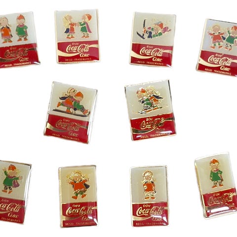 Coca-Cola OL pins sett i metall, flerfarget. Motivene viser ulike olympiske vinterleker, blant annet Oslo 1952, samt OL-symboler kombinert med Coca-Cola-logo. Pinsene har emaljert overflate med detaljer i rødt, hvitt, blått og gull. Egnet som samlerobjekt eller til dekor på jakker, vesker eller lignende.