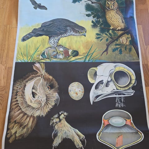 To eldre plansjer med opphengskrok som viser skandinaviske fugler og planter selges. De var lagret på et skoleloft og er eldre, så de har en rustikk sjarm. Må hentes, eventuelt møtes i nærområdet. 100 kr per stykk.