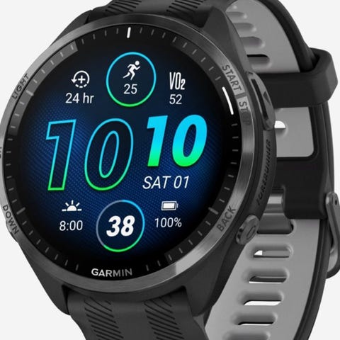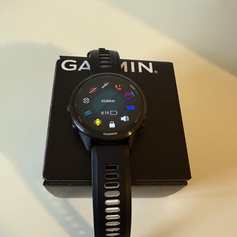 Garmin Forerunner 965 selges. Klokken ble kjøpt i mai 2025. Det er ett par synlige riper i skjermen når skjermen er av, men ellers som ny.