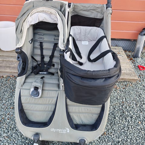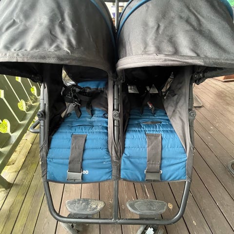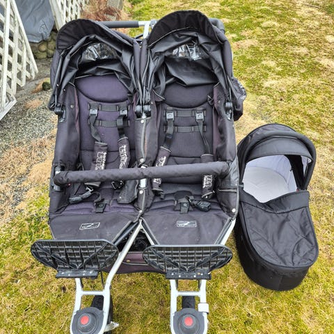 Dette er en tvillingvogn i veldig god stand. Den inkluderer også en del som kan brukes for babyer fra 0 1år . Vi kjøpte denne vognen for lenge siden, og noen plastdeler/adaptere som skal monteres sammen med den andre delen av vognen (den som brukes for mindre barn), De mangler, dessverre.