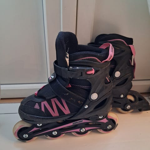 Rulleskøyter for barn. Kan justeres i størrelser mellom 28 - 32. Har en del synlige merker, men er ikke egentlig så mye brukt. Hjulene er av "myk" gummi (ikke hard/billig plast, som noen varianter har).