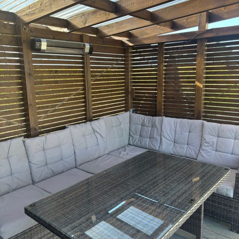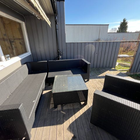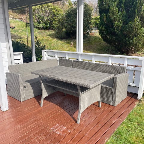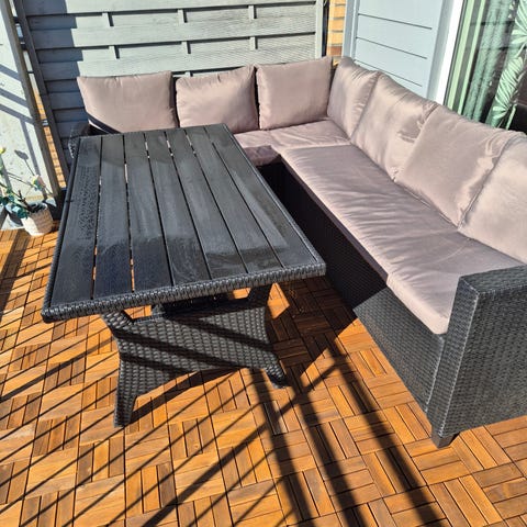 Hagegruppe med hjørnesofa og bord i grå kunstrotting. Sofaen består av flere moduler som danner en vinkelsofa med rette armlener og rygg. Bordet har rektangulær form med bordplate i glass og understell i matchende kunstrotting. Egnet for uteplass, terrasse eller hage som sittegruppe. Noe slitasje på flettingen enkelte steder, se bilder for detaljert tilstand.. Det følger med puter som er som nye. Så og si ikke brukt og alltid oppbevart innendørs.